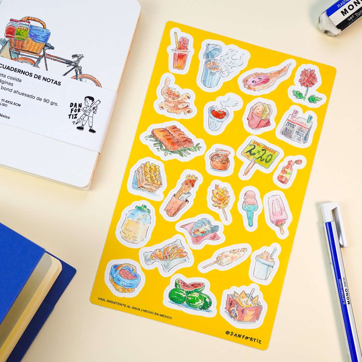 Stickers de ilustraciones inspiradas en objetos de la vida cotidiana en México.